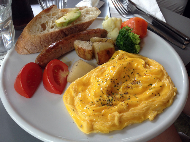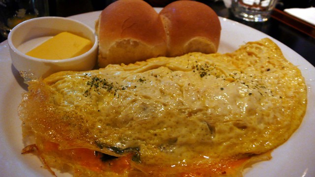 而我最愛的歐母雷,今天加的是巧達起司、菠菜跟培根。可惜的是也是菠菜感覺是手一滑,太多了讓其他的食物感覺不到味道。