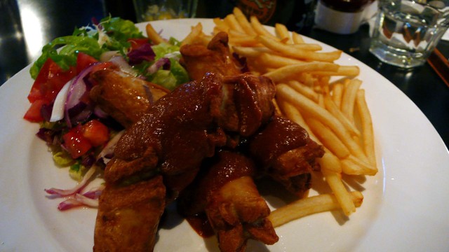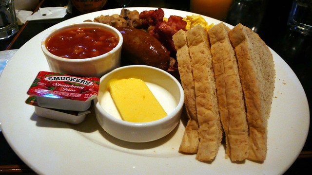 而最厲害的,應該是這個英式早餐,其實這已經是羽量級的了,菜單上還有一個重量級的英式早餐,不過一般人應該是無法吃完的,我們依稀看見遠方的一對情侶一起點了重量級的英式早餐,盤子還真的快要跟輪胎一樣大了,也真是漫恐怖的。